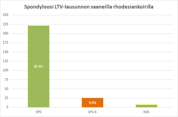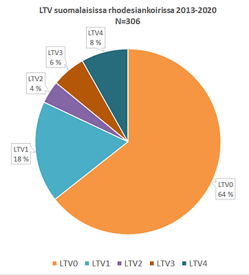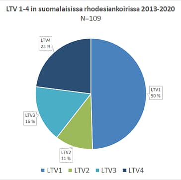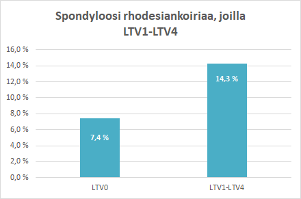 Jokin LTV-muutos löytyi 35,6 %:lla kuvatuista koirista. 6/8 lannenikamaa luokitellaan LTV:ksi vain Suomessa. LTV1-LTV3 tulos on 27,5 % selkäkuvatuista rhodesiankoirista.