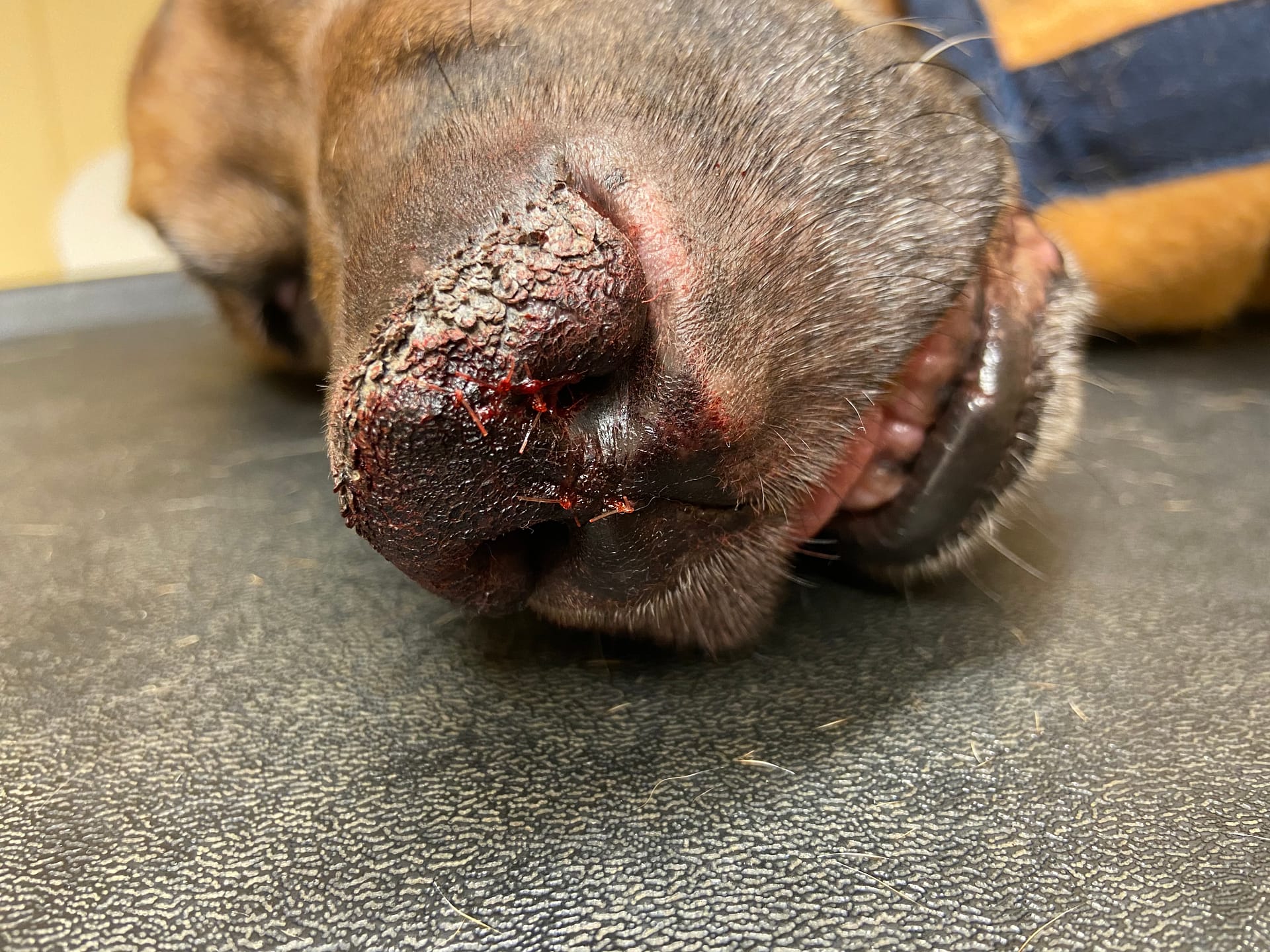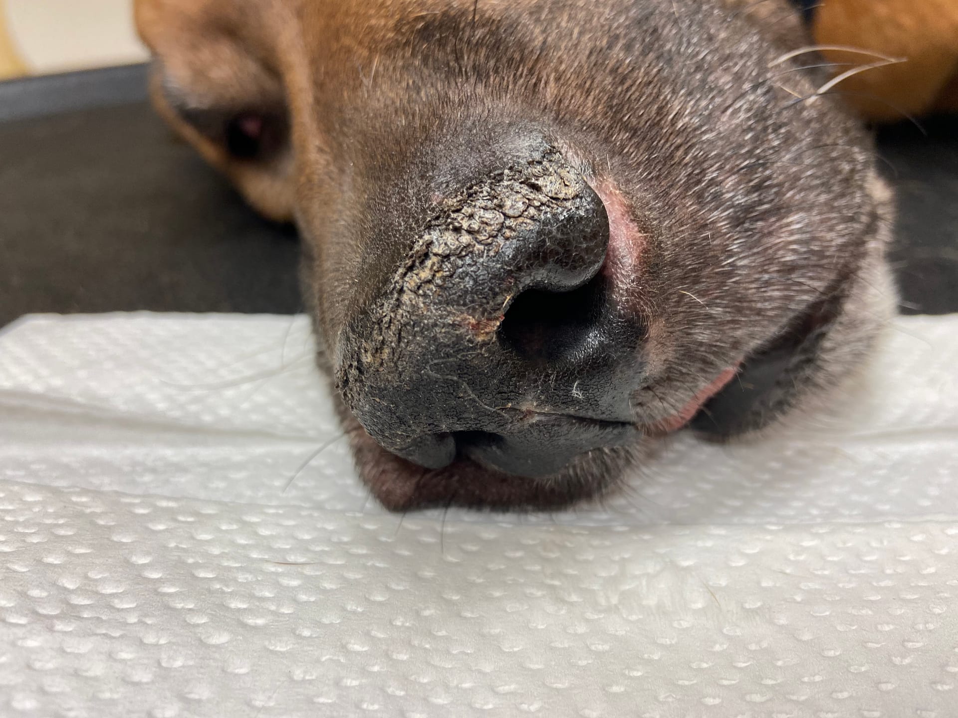 Oiva’s nose is getting worse. It’s gotten dryer, and has 2 laserations. Vet appointment ahead! As the symptoms are strongly referring to DLE a biopsy will be needed.