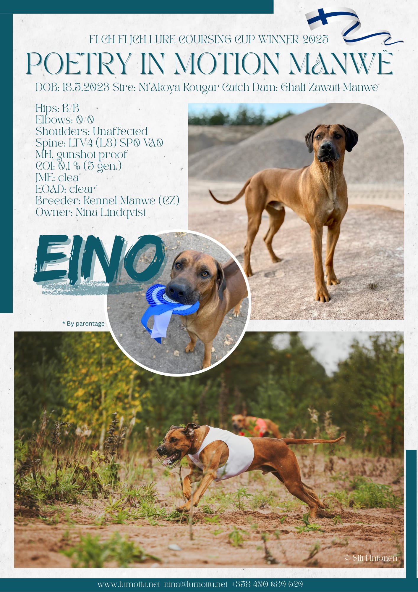 Poetry In Motion Manwë ”Eino” lauman nuorin, tuontina Tsekeistä Manwë-kennelistä. Eino on syntynyt 18.5.2023 ja se on Oivan tyätterenpoika. Einon sukutaulussa on paljon mielenkiintoisia esivanhempia.