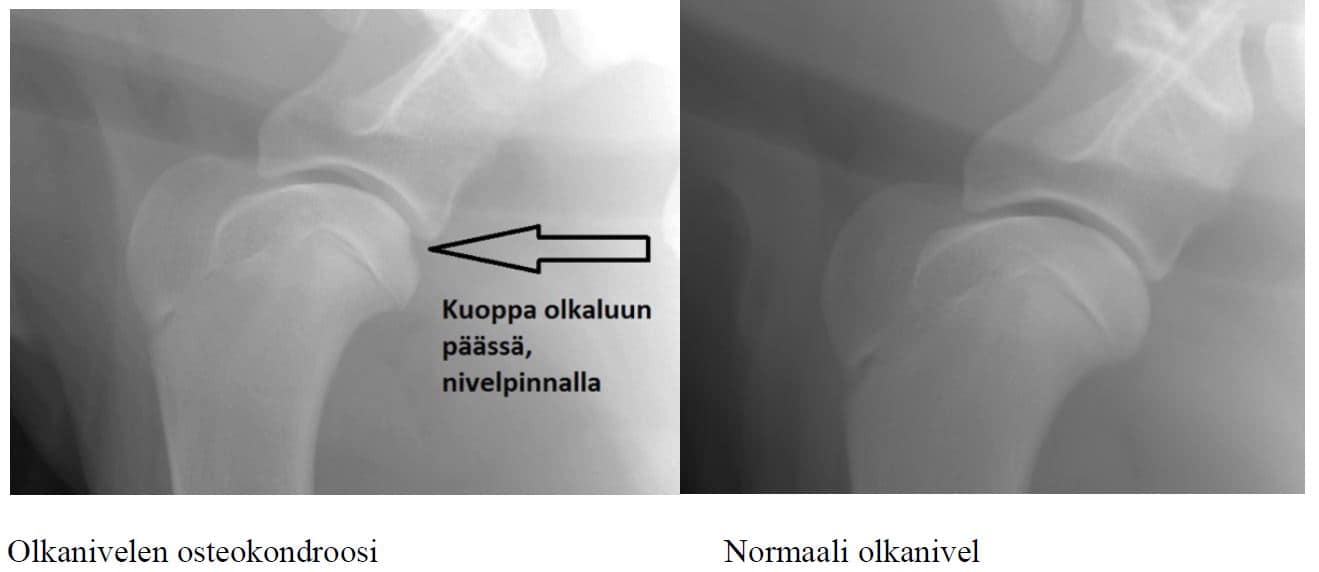 - OC-sairas (todettu osteokondroosimuutoksia): Olkaluun pään takapinnassa näkyy tasaantuma tai röntgenharva alue