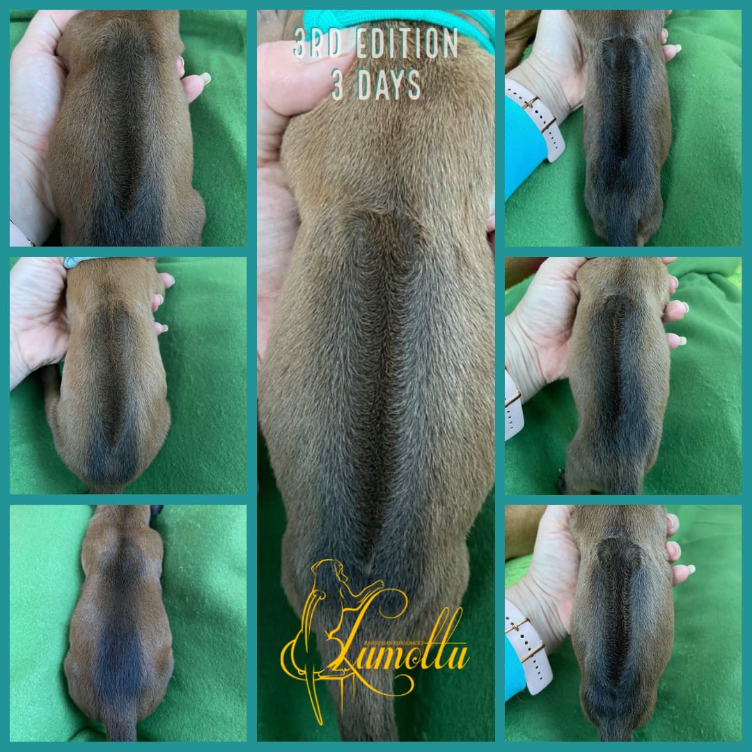 On April 19th Chanel gave birth to 8 little miracles. Puppy number 3, a girl with 4 crowns, had grown angelwings already before arrival and so we have 7 puppies in the box. 6 puppies with a ridge and 1 ridgeless. So far all all ridges seem to be correct, no kinks detected. DS will be checked later today. All puppies are spoken for.